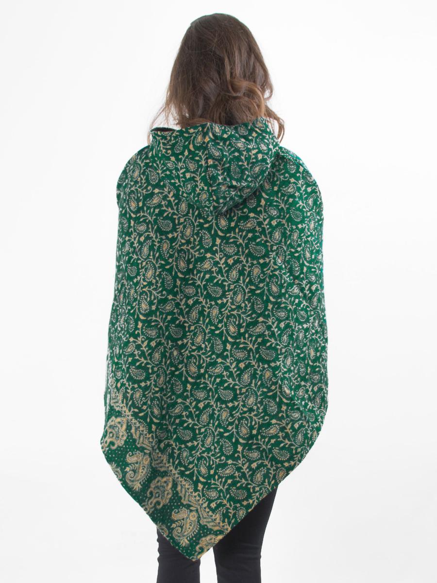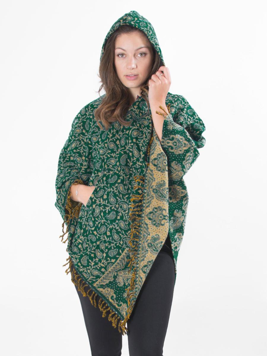 Avec ce poncho à capuche vert en laine à grand motif cachemire vous compléterez votre look avec chic et originalité tout en restant bien au chaud.